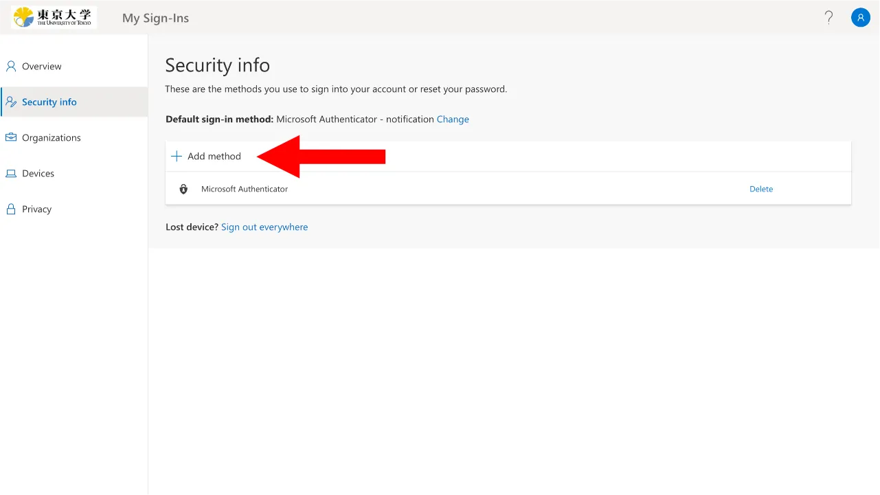 1. Click “Add method” in the Security info page.