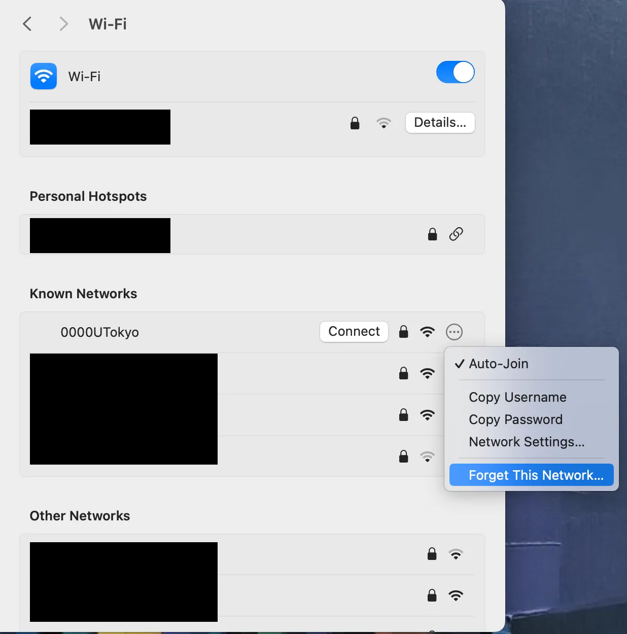 UTokyo Wi-Fi is a Wi-Fi service available to members of the University of Tokyo for educational and research purposes. Please refer to UTokyo Wi-Fi page first, which summarizes the general instructions for using the UTokyo Wi-Fi. If you still need the detailed instructions for terminal with macOS 13 Ventura, please refer to this page.