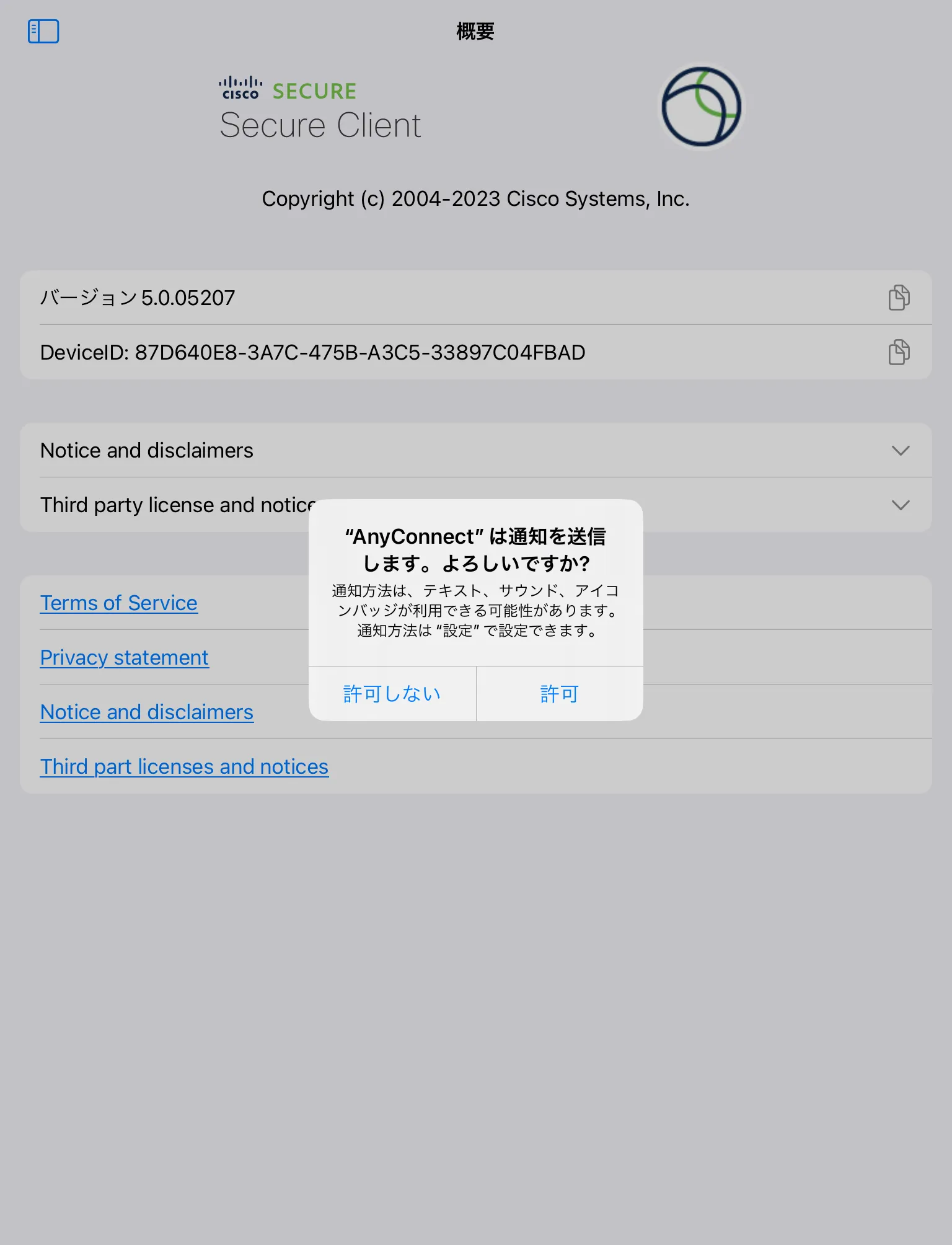 手順B: インストールを終えてSecure Clientアプリを開くと,下図1枚目のような画面が出ることを確認します.これでインストールは完了です.なお,開く際に下図2枚目のように通知の送信について確認する画面が表示されることがありますが,いずれを選択しても構いません.