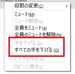 • 手を挙げている参加者を右クリックし,「手を下げる」「すべての手を下げる」を選択します.