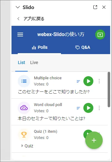• Webex上で作成したSlidoイベントは,主催者のSlidoイベント一覧のページに保存されます.