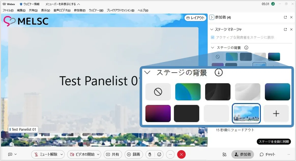 ※停止した場合,出席者はステージマネージャーで設定した背景などは利用することはできません.再度「同期」するとステージマネージャーで設定したレイアウトを使用できます.