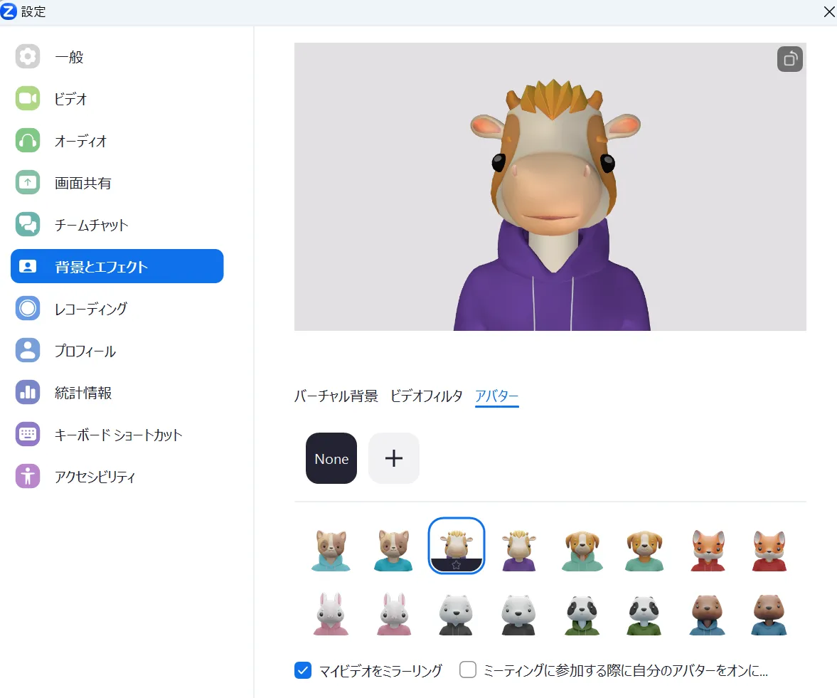 3. 好みのアバターを選んでください.(アバターを設定するとカメラに映る背景が表示されなくなり,アバターだけが表示されるようになります.バーチャル背景を設定している場合は設定している画像がアバターの背後に表示されます.) ※バーチャル背景設定時